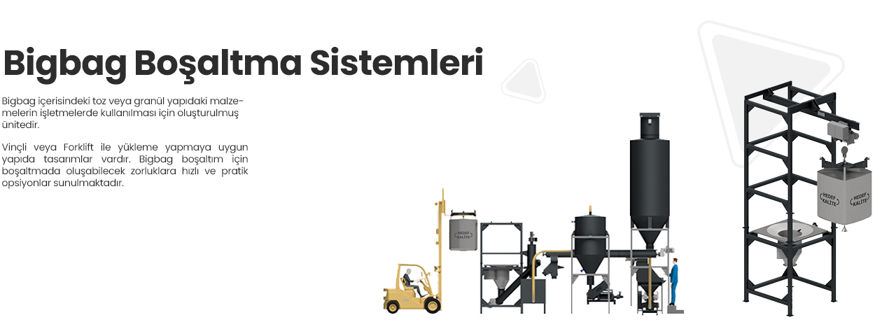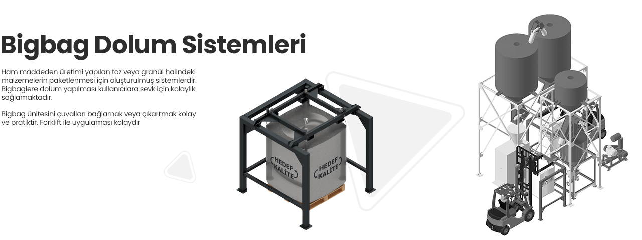 Ham maddeden üretimi yapılan toz veya granül halindeki malzemelerin paketlenmesi için oluşturulmuş sistemlerdir. Big bag'lere dolum yapılması kullanıc..