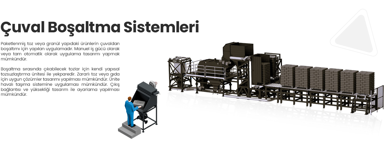 Paketlenmiş toz veya granül yapıdaki ürünlerin çuvaldan boşaltımı için yapılan uygulamadır. Manuel iş gücü olarak veya tam otomatik olarak uygulama ta..